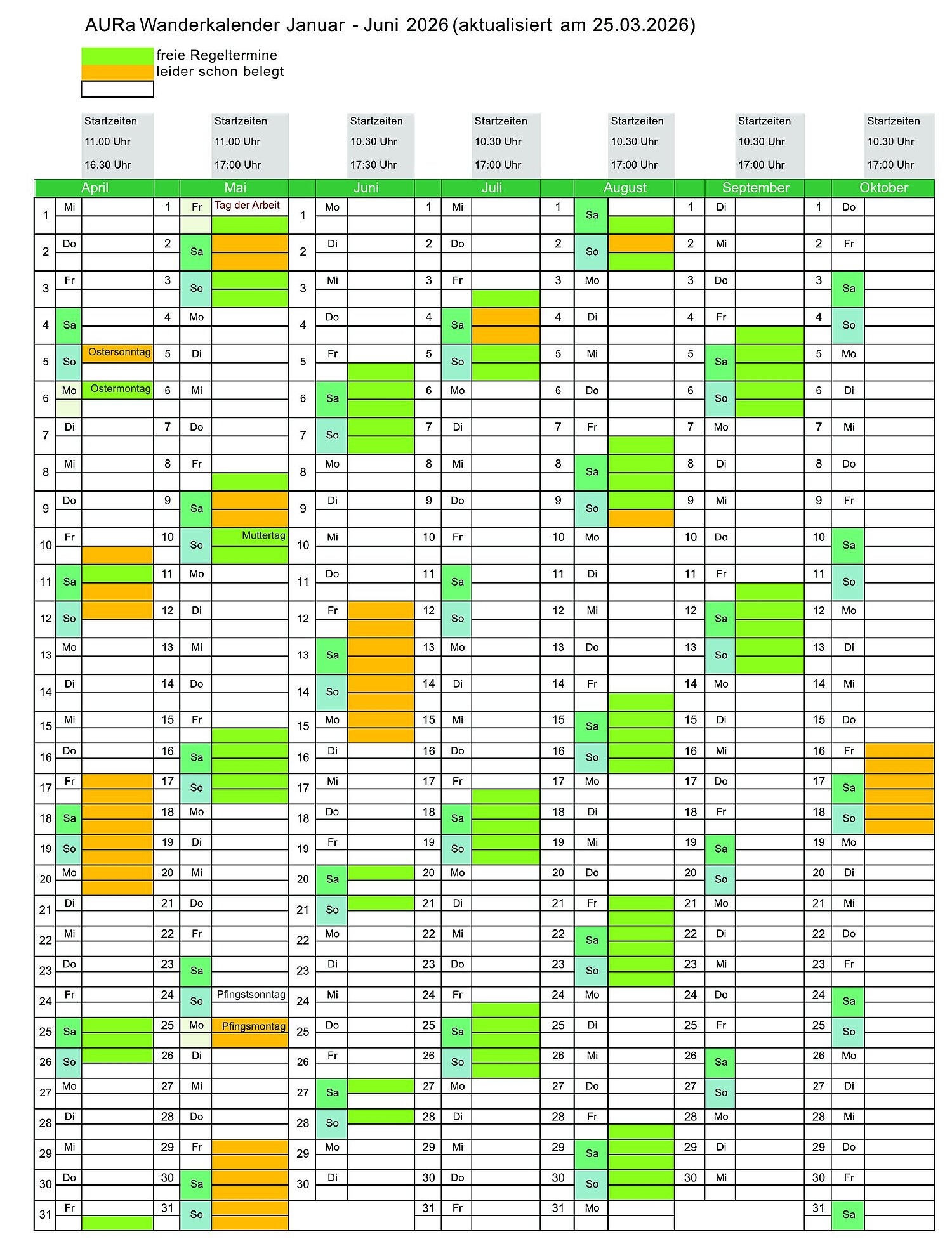 Den Wander-Kalender bitte anklicken, dann wird er vergrößert dargestellt. Grün markierte Termine sind freie Regeltermine, orange ist bereits belegt, weiß markierte Tage können individuell vereinbart werden, auch unter der Woche. Wir freuen uns auf Ihre Anfrage!
